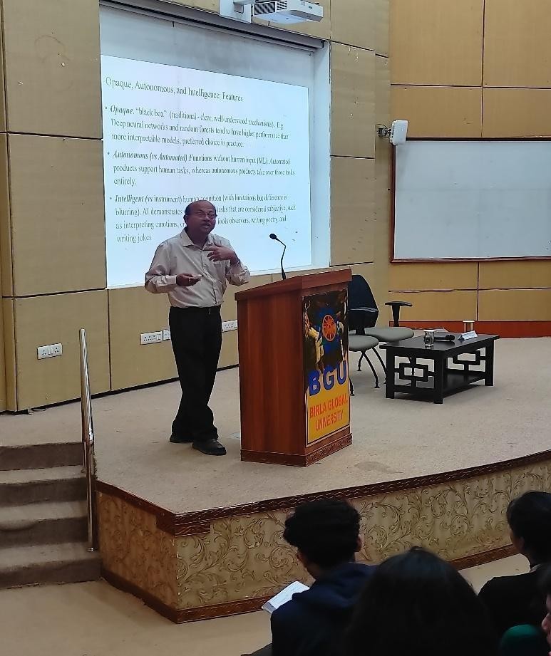 | Highlight s of the Event | Birla School of Management, Birla Global University, Bhubaneswar, organised an event on “Generative AI in Business” on 24th January 2025. Dr. Prabin Kumar Panigrahi, professor in the Information System area, IIM Indore, graced the function as the resource person. Ms. Anita Mohapatra, a student volunteer of the Operations Club, introduced the guests and set the theme of the seminar. Dr. Prabin Kumar Panigrahi addressed the students by giving valuable insights into the industry practices. Dr. Panigrahi emphasized the functioning of AI as compared to Generative AI and focused on the AI Agents. Mr. Ayush Kumar Dash, a member of the Operations Club, gave the vote of thanks. Students of Birla Global University attended the event. |