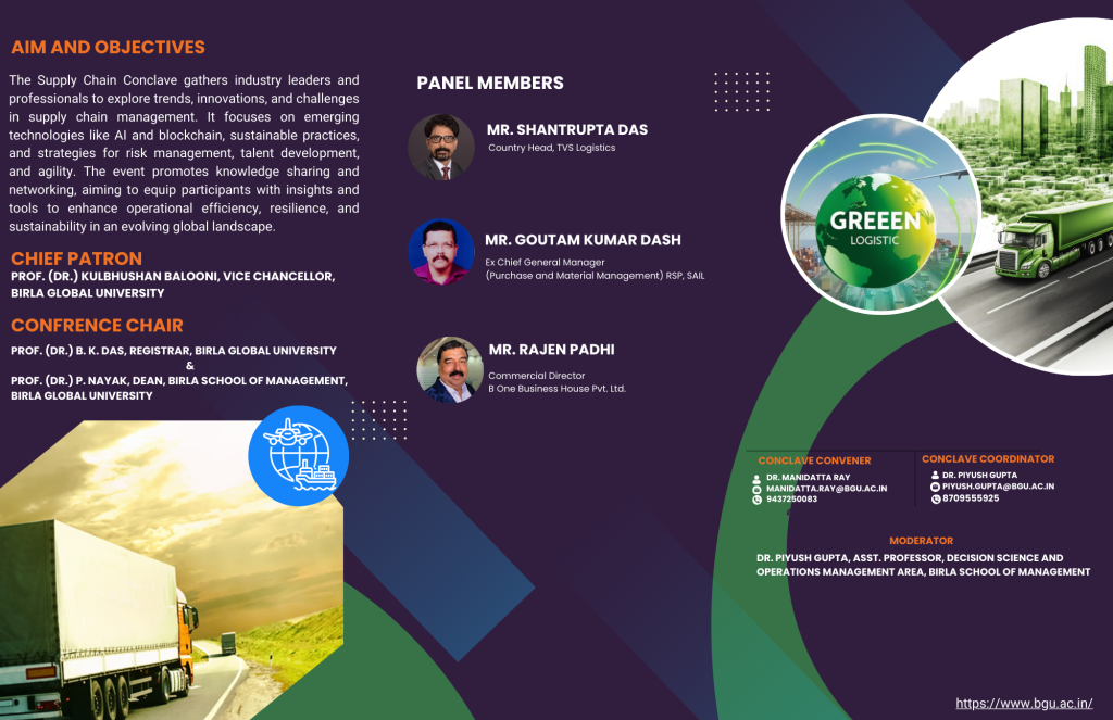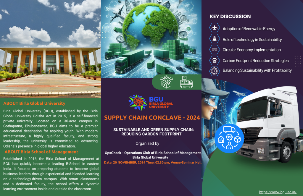 | introduced the theme. Dr. B.K. Das, Registrar, Birla Global University addressed the conclave by emphasizing the environmental degradation from past to present. Mr. Santrupta Das addressed the students by giving some valuable insights into the industry practices. Prof. Kulbhushan Balooni, Vice Chancellor, Birla Global University gave the presidential address. Distribution of prizes was done to the winners of the Poster Making Competition organized by Operation Club – “OpsCheck” on 18th Nov 2024. Dr. Manidatta Ray gave the vote of thanks. The conclave had an inaugural session and one-panel discussion on Sustainable and Green Supply Chain: Reducing Carbon Footprints. The moderator for the Panel Discussion was Dr. Piyush Gupta, Co-Convener and Assistant Professor (Decision Science and Operations Management). The panellists (Mr. Rajen Padhi and Mr. Goutam Kumar Dash) from various industries shared their knowledge and experience which was very interesting, insightful and enriching. The conclave was attended by students of Birla Global University. The panel discussion was concluded with the vote of thanks proposed by Dr. Manidatta Ray.
